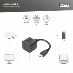 Pasivni HDMI splitter je idealna rešitev za povezavo dveh televizorjev ali monitorjev na en HDMI priključek računalnika ali prenosnika, z podporo kakovosti Full HD (1080p). Ni mogoče hkratno uporabo obeh naprav.