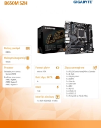 GIGABYTE B650M S2H je zanesljiva osnova za sodoben PC s platformo AMD AM5. Plošča združuje zmogljivost in učinkovitost zahvaljujoč digitalnemu VRM, podpira dvod kanalni DDR5 in omogoča visoke prenosne hitrosti z režo M.2 PCIe 4.0 x4. Ne manjkajo kakovostne zvočne komponente in ločena zvočna vezja za čist zvok.
