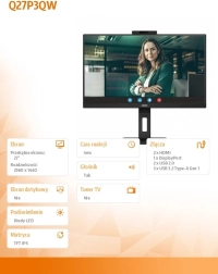 Ergonomski in eleganten monitor AOC Q27P3QW nudi odlično vizualno izkušnjo zahvaljujoč tehnologiji IPS, ki zagotavlja živahne barve in široke kote gledanja. Ta monitor je idealen za pisarniško delo in zabavo.