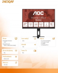 Monitor AOC velikosti 24 palcev ima IPS panel, ki zagotavlja jasne in živahne barve iz katerega koli kota. S podporo HDMI in DP konektorjev imate prilagodljivost za priključitev različnih naprav. Pivot funkcija omogoča nastavitev zaslona po vaših željah, vgrajeni zvočniki pa zagotavljajo multimedijske užitke.
