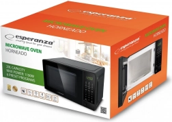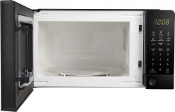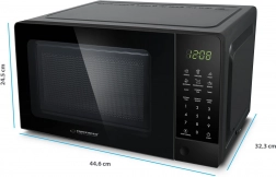 Mikrovalovna pečica ima eleganten črn dizajn, digitalni nadzorni panel in zaslon za enostavno nastavitev funkcij, kot so kuhanje, odmrzovanje in segrevanje.
