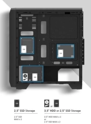 To ohišje ponuja veliko prostora za HDD in SSD diske, pri čemer podpira hladilnike procesorjev do višine 156 mm in grafične kartice dolžine do 330 mm. Sprednje in zadnje hlajenje z možnostjo namestitve do 8 ventilatorjev zagotavlja odličen pretok zraka, kar maksimira zmogljivost in zaščito komponent vašega računalnika.
