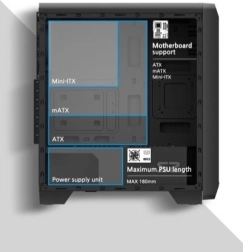 Podpora različnim formatom osnovnih plošč in prostorna notranjost omogočata enostavno namestitev komponent in nadgradnjo vaše PC konfiguracije.