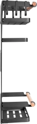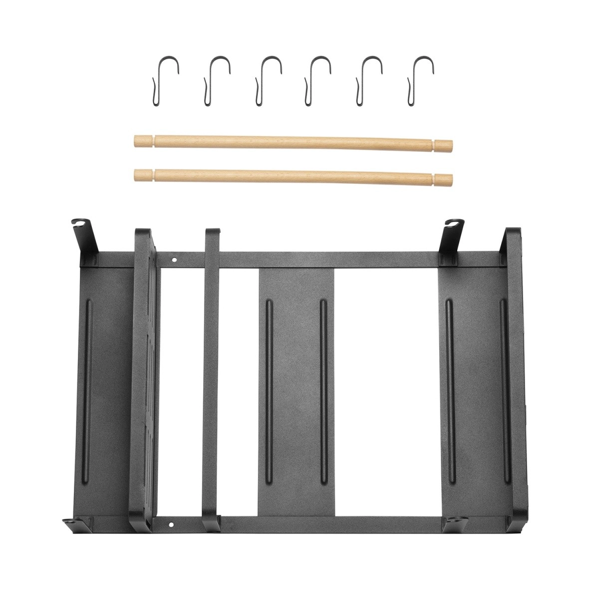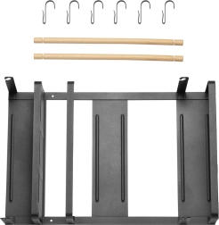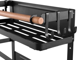 Široko držalo za papirnate brisače je primerno za večino brisač na trgu. Šest odstranljivih kavljev lahko uporabite na primer za obešanje skodelic za kavo, skodelic ali kuhinjskih pripomočkov. Zaradi univerzalnega in elegantnega dizajna se polica zlahka vklopi v notranjost vsake kuhinje. Lesen element nima le dekorativne funkcije, temveč tudi ščiti nameščene izdelke pred izpadanjem. Trije močni magneti omogočajo enostavno in hitro namestitev police na kovinsko površino, na primer na hladilnik ali pralni stroj, brez vrtanja in uporabe orodja. Največja nosilnost je 12 kg.