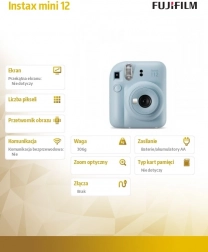 Fotoaparat Instax Mini 12 je zasnovan tako, da je vsak trenutek, ujet skozi vaš objektiv, mogoče takoj natisniti. Njegova kompaktna zasnova vključuje zmogljiv blisk in retraktivni objektiv, ki omogoča ustvarjanje odličnih posnetkov v različnih svetlobnih razmerah.