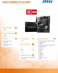 Osnovna plošča MSI B760 Gaming Plus Wifi ponuja širok nabor funkcij, ki maksimirajo igralno zmogljivost in stabilnost sistema. Njena robustna zasnova vključuje 12+1 Duet Rail napajanje, ojačitev za CPU in pomnilnik, kar zagotavlja najboljši možni izkoristek vaših komponent.