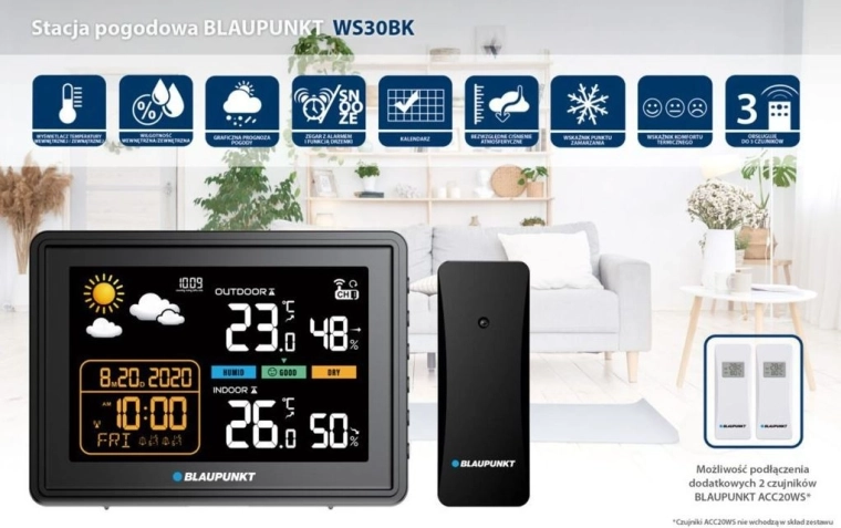 Meteo postaja BLAUPUNKT WS30BK vam pri tem pomaga z prikazom temperature in vlažnosti v prostoru in zunaj njega. Povedala vam bo, ali je v vaši dnevni sobi preveč suho, preveč vlažno ali ravno prav! Poleg tega boste izvedeli, kakšen je trenutni zračni tlak in kakšna je vremenska napoved za prihajajoči dan. Ura z budilko in koledarjem vam bo prav prišla tudi v vsakdanjem življenju.