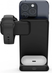 Polnilec MagSpot Stand 3‑v‑1 prihrani prostor in čas: z enim elegantnim stojalom brez kabelskega kaosa napolnite svoj iPhone z MagSafe (iPhone 12 in novejši), vse modele Apple Watch ter brezžične slušalke v etuiju. Povišan obroč MagSafe zagotavlja zanesljiv magnetni oprijem tudi pri modelih z večjim modulom kamere, telefon lahko uporabljate navpično ali v načinu StandBy.