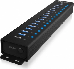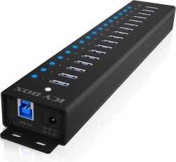 ICY BOX IB-HUB1717 je zmogljiv 17‑portni USB razdelilnik, zasnovan za delovne postaje, strežnike, delavnice in studie. Ponuja 16 priključkov USB 3.2 Gen 1 Type‑A za podatkovne prenose do 5 Gb/s na vsakem priključku ter en namenski priključek USB‑A za hitro polnjenje mobilnih naprav. Robustno popolnoma kovinsko aluminijasto ohišje zagotavlja zanesljivost in učinkovito odvajanje toplote tudi v zahtevnih pogojih.