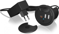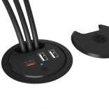 Kompaktna namizna polnilna postaja z vgradnjo v odprtino 60 mm ponuja hitro polnjenje USB‑C s PD 3.0 in QC do 27 W ter dva USB‑A priključka 10 W za hkratno napajanje več naprav. Ploska, elegantna zasnova prihrani prostor, namestitev brez orodja je opravljena v nekaj minutah, zaščitni pokrovček pa ohranja priključke čiste in pripravljene za uporabo.