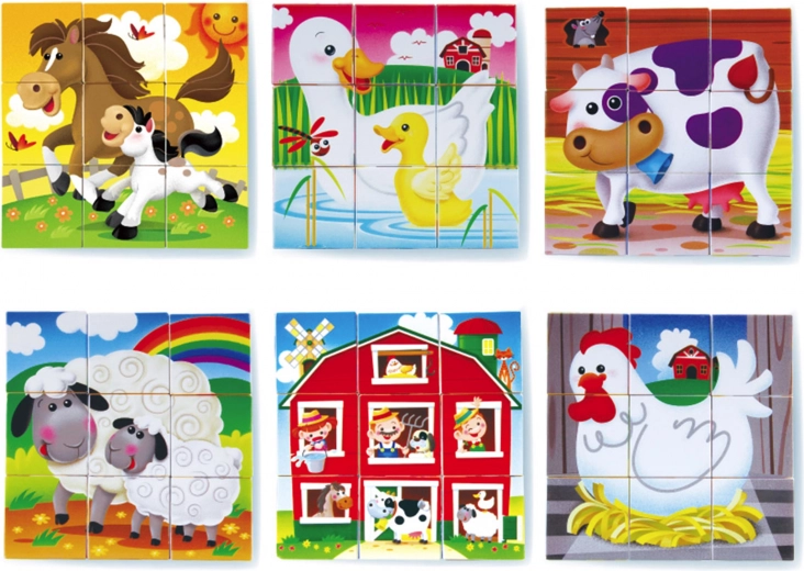 Odkrijte čar kmetije z lahkimi plastičnimi kockami, ki so enostavne za prijem tudi za majhne otroške ročice. Vsaka stran kock tvori drugačno sliko, zato lahko otroci sestavljajo 6 različnih motivov ter se učijo prepoznavati oblike, barve in povezave.