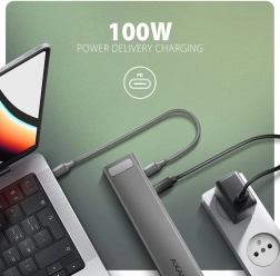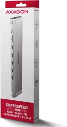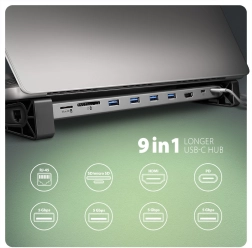 AXAGON HMC-10HLS LONGER prinaša univerzalno doku postajo 9-v-1 za sodobne naprave z USB-C. Priključite monitor v ločljivosti do 4K/60 Hz, štiri USB periferije, ožično omrežje prek GLAN in izkoristite čitalnik SD/microSD za hiter prenos podatkov. Vrata USB-C PD 100 W napajajo in polnijo prenosnik, zato ne izgubite nobenega priključka.