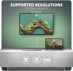 Z zahvaljujoč hitremu vmesniku USB 3.2 Gen 1 (5 Gb/s) brez težav hkrati upravlja tudi dva zunanja diska, omogoča polnjenje telefona ali tablice do 1,5 A/5 V ter podpira HDR, visoke frekvence osveževanja (do 2K/144 Hz, Full HD/240 Hz) in HDCP 1.4–2.3. Aluminijasta konstrukcija zagotavlja vzdržljivost in pasivno hlajenje; priložene podloge omogočajo uporabo huba kot stojala za boljše hlajenje prenosnika.