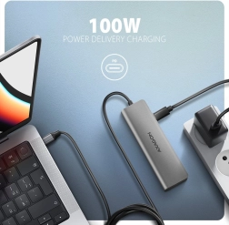 - USB‑C Power Delivery 3.0 do 100 W (samo napajanje); napajanje prenosnika prek huba; PD morata podpirati tako prenosnik/telefon kot polnilnik