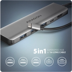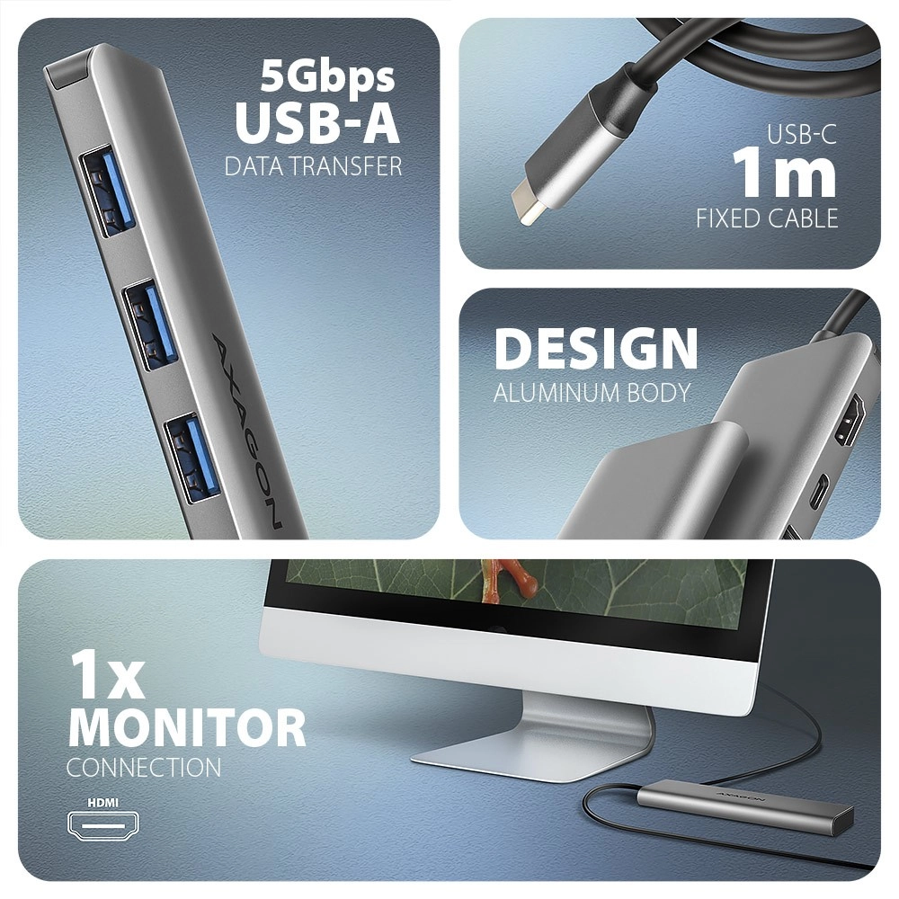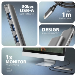 Kompakten USB‑C hub 5‑v‑1 razširi vaš prenosnik s petimi vrati: 3× USB‑A 5 Gbps za hiter prenos podatkov in polnjenje, HDMI do 4K/30 Hz za priklop monitorja ter USB‑C Power Delivery do 100 W za sprotno napajanje prenosnika. Zahvaljujoč 1 m USB‑C kablu lahko hub postavite točno tja, kjer ga potrebujete. Aluminijasto ohišje zagotavlja vzdržljivost in pasivno hlajenje, podpora za Plug & Play in Hot Plug pa omogoča izjemno enostavno priključevanje.