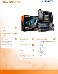 Osnovna plošča Gigabyte B650 Eagle AX za podnožje AMD AM5 prinaša stabilno zmogljivost z digitalnim VRM 12+2+2, podporo za DDR5 s profili AMD EXPO / Intel XMP, hitro shrambo PCIe 5.0/4.0 M.2, sodobni Wi‑Fi 6E in bogato povezljivost, vključno z HDMI, DisplayPort in USB 10 Gb/s.