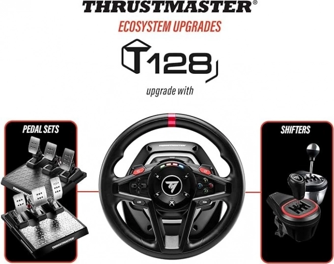 Dirkalni volan T128 je opremljen s sistemom HYBRID DRIVE, ki z uporabo mehanizma s pasovi in zobniki zagotavlja bolj realistično in vsestransko povratno informacijo sil. Za 20 % višja zmogljivost v primerjavi s prejšnjimi hibridnimi volani Thrustmaster TMX vam omogoča avtentične občutke in olajša optimizacijo idealne linije. Najnovejši LED-pas s 4 barvami vam omogoča spremljanje vrtljajev motorja in trenutka za prestavljanje. Montažni sistem z nastavljivo spono poenostavi hitro in enostavno pritrditev na različne debeline miz in pisalnih miz. Komplet pedal T2PM, priložen volanu, je opremljen s patentirano tehnologijo brez trenja z magnetnimi senzorji, ki zagotavljajo dolgotrajno visoko natančnost.