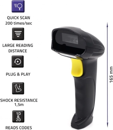 Z vmesnikom Plug&Play deluje takoj po priklopu prek USB, brez namestitve programske opreme. Hitrost do 200 skenov/s, enostavno branje pod različnimi koti in odpornost na padce do 1,5 m naredijo ta čitalnik zanesljivega pomočnika za inventure, prevzem blaga in delo na blagajni.