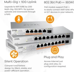 Zyxel XMG-108 je idealna izbira za igralce, ustvarjalce vsebin in male pisarne. Ponuja polno 2,5G prepustnost na vseh osmih kovinskih vratih ter dodatni 10G SFP+ za povezavo NAS-a, strežnika ali uplink na hitro hrbtenico. Vpeljava je hipna – preprosto priklopite in deluje.