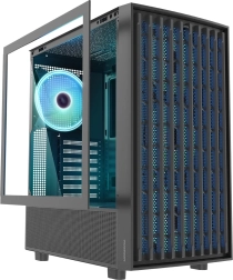 Stranica iz kaljenega stekla s pripenjalnimi zapirali omogoča hiter dostop do komponent brez vijakov. Notranjost sprejme hladilnik CPU do 175 mm in grafično kartico do 330 mm (do 360 mm po odstranitvi sprednjih ventilatorjev). Za shranjevanje je pripravljen koš v tunelu napajalnika za 2 diska (SSD/HDD) ter dodatna mesta M.2 glede na matično ploščo.