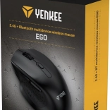 Uživajte v svobodi treh brezžičnih možnosti v eni napravi. Miška YENKEE EGO ponuja klasično 2,4 GHz povezavo prek USB sprejemnika in dve ločeni Bluetooth povezavi (BT1 in BT2) – idealno za prenosnike in naprave brez vrat USB‑A. Seznanjanje je hitro, po njem pa lahko takoj preklapljate med tremi napravami z enim dotikom preklopnika na spodnji strani.