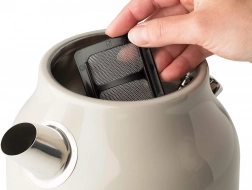 Čisto vodo brez oblog zagotavlja nerjavni filter proti vodnemu kamnu, ki ga lahko preprosto odstranite, očistite in znova namestite. V paketu poleg tega najdete rezervni filter za daljšo življenjsko dobo aparata. Za varnost skrbijo samodejni izklop po doseženem vrenju, zaščita pred pregrevanjem in pred vklopom brez vode, medtem ko nedrseče nogice in ergonomski ročaj zagotavljajo udobno uporabo.