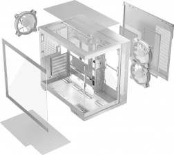 Bela računalniška omarica Volcano Panorama APEX ARGB 3F MIDI je popolna kombinacija estetike in funkcionalnosti. Vsebuje do tri ARGB ventilatorje za učinkovito hlajenje in stilsko osvetlitev. Zahvaljujoč dvema steklenima ploščama lahko svoje komponente postavite v središče pozornosti.