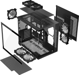 Sprednja in stranska plošča iz kaljenega stekla efektno razstavita vaše komponente. Čiste linije, RGB osvetlitev in enostaven dostop do sestava brez vijakov dodajo PC-ju premium videz in udobno servisiranje.