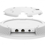 Varnost krepi WPA3, do 24 ločenih SSID-jev, prijava prek SMS/Voucher in zaznavanje nepooblaščenih AP-jev. Elegantno in tanko okroglo ohišje (pribl. 220 × 32,5 mm) je idealno za stropno ali stensko montažo in omogoča učinkovit odvod toplote.