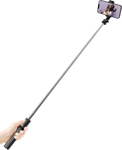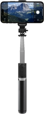 Po raztegnitvi integriranih nogic služi kot stabilen stativ za snemanje videov ali fotografiranje na daljavo. Nosilec za telefon z nastavljivim nagibom v razponu 240 stopinj omogoča enostavno nastavitev natančnega posnetka. Upravljalnik ima doseg do 10 metrov, kar povečuje njegovo uporabnost. V zloženem stanju meri le 194 mm, zato ga zlahka pospravite v nahrbtnik ali torbo.