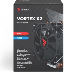 Hladilnik procesorja Savio Vortex X2 združuje učinkovito odvajanje toplote s tihim delovanjem, kar zagotavlja stabilno zmogljivost tudi pri visoki obremenitvi, na primer pri grafičnem renderiranju ali igrah. S kompaktnimi dimenzijami 122 × 76,5 × 157 mm se zlahka prilega standardnemu ohišju računalnika.
