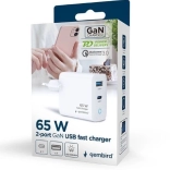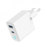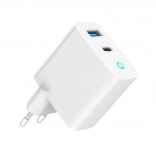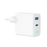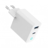 Kompakten omrežni polnilec s tehnologijo GaN ponuja moč 65 W za hitro polnjenje telefona, tablice in prenosnika. Z dvojico priključkov USB‑C in USB‑A podpira Power Delivery (PD) in Quick Charge 3.0, praktični LED indikator pa prikazuje stanje napajanja.