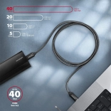 Kabel AXAGON USB‑C – USB‑C ponuja široke možnosti uporabe zahvaljujoč specifikaciji USB4 Gen 3x2 in polni združljivosti s Thunderbolt 3. Zasnovan je za hiter prenos podatkov do 40 Gb/s, prenos videa v visoki ločljivosti 8K in učinkovito polnjenje naprav. Odlikujeta ga izjemna vzdržljivost in prilagodljivost zaradi najlonske pletenice.