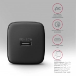 Kompakten omrežni polnilec AXAGON 20W z enim USB‑C priključkom hitro napolni telefone in tablice zahvaljujoč standardoma PD 3.0 / QC 4+. Podpira izhod do 20 W, je združljiv z iPhone, Samsung, Huawei, Xiaomi ipd. ter ponuja napredne zaščite za varno polnjenje.