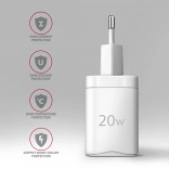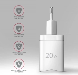 Polnilec podpira 20 W polnjenje za iPhone 12, 13, 14 in 15 ter njihove modele Pro in Pro Max. Adapter je združljiv tudi z drugimi standardi hitrega polnjenja za telefone Apple iPhone, iPad, Samsung, Huawei, Honor, Xiaomi.