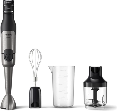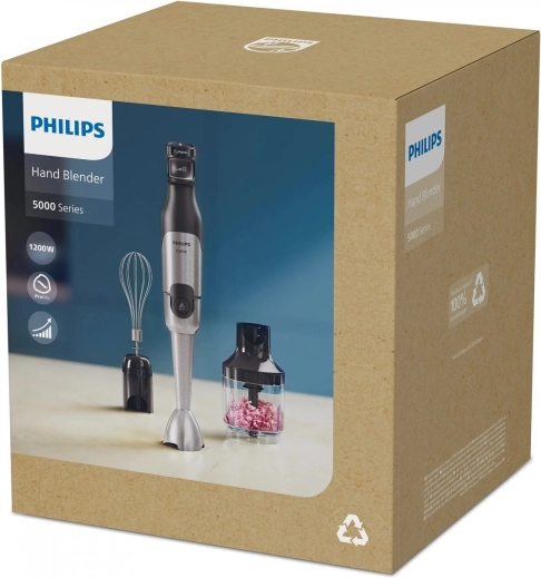 Močan palični mešalnik PHILIPS iz serije 5000 z močjo 1200 W premaga tudi najtrše sestavine. Zahvaljujoč tehnologiji ProMix ponuja hitro in enakomerno mešanje brez škropljenja, gladko upravljanje SpeedTouch in praktične dodatke, vključno s sekljalnikom 0,5 l, metlico za stepanje in merilnim vrčem.
