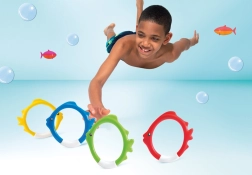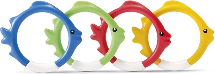 Komplet potapljaških obročev Intex v obliki rib je idealen pripomoček za igrivo učenje potapljanja. Zaradi izrazitih barv in stabilne postavitve na dno bazena otroci cilj zlahka najdejo ter z veseljem vadijo zadrževanje sape in orientacijo pod vodo.