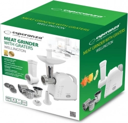 ESPERANZA Wellington je sodoben in funkcionalen pomočnik, ki združuje mlin za meso in ribežen v enem ohišju. V načinu mletja se spopade ne le z mesom, temveč tudi z drugimi živili, vključno s pripravo zmesi za polpete ali paštete. Način ribanja olajša rezanje in drobljenje sadja, zelenjave, trdega sira, čokolade ali oreščkov – idealno za hitro pripravo solat, sladic in posipov.