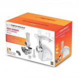Multifunkcijski električni mlinček za meso z ribežnom Esperanza RISSOLE je zanesljiv pomočnik v vsaki kuhinji. Zlahka zmelje meso in druge sestavine, s kompletom nastavkov pa pripravi tudi domače klobase ali kebbe. Ribežni nastavek obvlada sadje, zelenjavo, trdi sir, čokolado in oreščke. Stabilno delovanje zagotavljajo nedrseče nogice.
