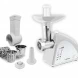 - Bogata oprema: 3 sita (3/5/7 mm), 3 ribežni bobni, nastavek za klobase in kebbe.