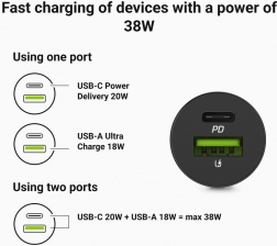 Odkrijte zmogljivost in kompaktne mere v enem. Avtopolnilnik GREEN CELL PowerRide Nano38 s skupno močjo 38 W združuje USB‑C PD 20 W za moderne telefone in tablice ter USB‑A 18 W Ultra Charge za hitro polnjenje vaše opreme. Minimalistična zasnova z aluminijasto konstrukcijo se odlično poda notranjosti vsakega vozila.