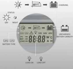 Maksimirajte izkoristek svoje fotovoltaike z MPPT (Maximum Power Point Tracking), ki neprekinjeno optimizira napetost in tok iz panelov ter zagotavlja najvišjo možno učinkovitost tudi v spremenljivih razmerah, kot so delno senčenje ali nihanje intenzivnosti svetlobe. Vgrajen LCD zaslon nudi pregled nad ključnimi parametri in olajša nastavitve.