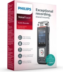 PHILIPS VoiceTracer DVT6115 je pametni diktafon, zasnovan za čist in naraven posnetek v vsaki situaciji. Trojica visokozvestnih mikrofonov z visokim razmerjem signal/šum, kakovostnim vpetjem in izrazitim ločevanjem kanalov zajame podroben stereo zvok, ki deluje kot v živo. Snemate lahko v univerzalnem formatu MP3 ali nekompresiranem PCM (WAV) v kakovosti blizu CD, snemanje pa lahko udobno upravljate na daljavo prek aplikacije Philips VoiceTracer.