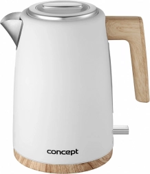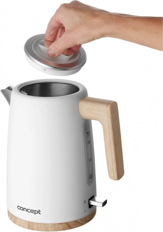 Odkrijte lepoto in funkcionalnost v enem. Grelnik CONCEPT ELWOOD v beli barvi z lesenimi poudarki se odlično poda tako v moderno kot tradicionalno kuhinjo. Zahvaljujoč prostornini 1,7 l boste hitro pripravili vodo za vso družino, medtem ko skrita grelna spirala olajša čiščenje in zmanjšuje nastajanje vodnega kamna.