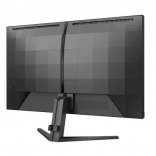 Monitor ima elegantno črno ohišje, ki ga dopolnjuje minimalistično stojalo, kar poudarja stabilnost in slog.