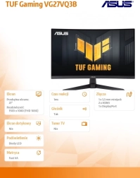 ASUS TUF Gaming VG27VQ3B je 27" igralni monitor, ki združuje ukrivljen zaslon za boljšo potopitev v igro, bliskovit odziv 1 ms ter praktične priklope prek 2× HDMI in DisplayPort. Zaradi igralnih izboljšav in robustne TUF zasnove je idealen za igralce, ki želijo stabilno zmogljivost brez kompromisov.