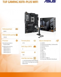 TUF Gaming X870-PLUS WIFI združuje najsodobnejše tehnologije platforme AMD s poudarkom na vzdržljivosti in stabilnosti. Zahvaljujoč kakovostnim napajalnim fazam, masivnim hladilnikom in premišljeni razporeditvi rež zagotavlja konstantno zmogljivost, nizke temperature in visoko združljivost z vrhunskimi komponentami.