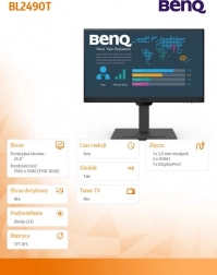 BenQ BL2490T je 24-palčni monitor na tehnologiji IPS, ki zagotavlja verno prikazovanje barv in stabilno sliko iz kateregakoli kota. Zahvaljujoč odzivu 4 ms zlahka obvlada dinamično vsebino, kontrastno razmerje 1300:1 pa doda sliki globino in berljivost. Povezava prek HDMI omogoča enostavno priključitev na prenosnik, PC ali priklopno postajo.