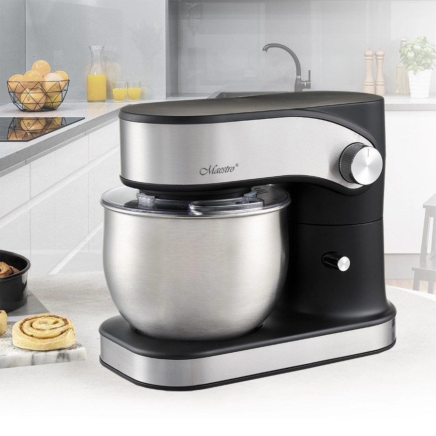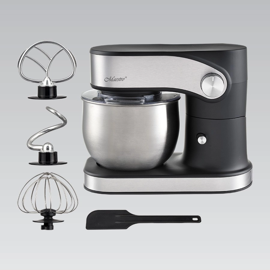 Priloženi so kavelj za gnetenje, mešalna metlica in balonasta metlica za stepanje, zato boste pripravili kruh, palačinke in puhast sneg iz beljakov. Prozoren pokrov z odprtino preprečuje škropljenje in omogoča dodajanje sestavin med delovanjem. Za enostavno rokovanje poskrbi samodejno odpiranje glave, stabilnost zagotavljajo protizdrsne gumijaste nogice, varnost pa podpirata varovalo in zaščita pred pregrevanjem.