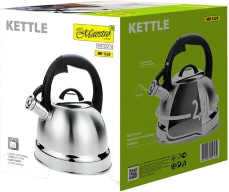 Stilski čajnik s piščalko Maestro s prostornino 2,9 l iz kakovostnega nerjavnega jekla in trpežne plastike. Ponuja negrejoč se ročaj, zlahka snemljiv pokrov za udobno čiščenje in večslojno kapsulirano dno za hitro in enakomerno segrevanje. Primeren za vse vrste štedilnikov, vključno z indukcijo.